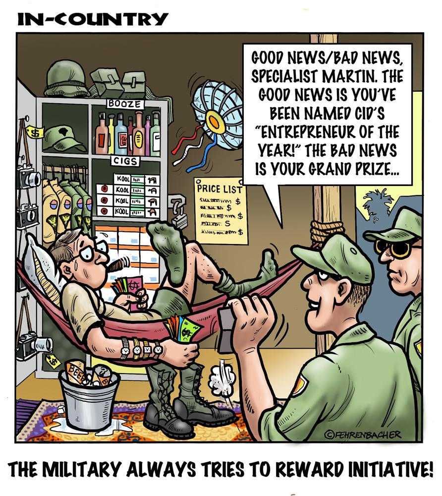 Phil enlisted in the Army in 1965 where you served for years in Vietnam. He became a graphic designer and has worked for the state of Oregon for 26 years. He retired in 2003 and started the Cartoon "In-Country". The cartoons reflect his experiences during his tour of duty in South Vietnam.